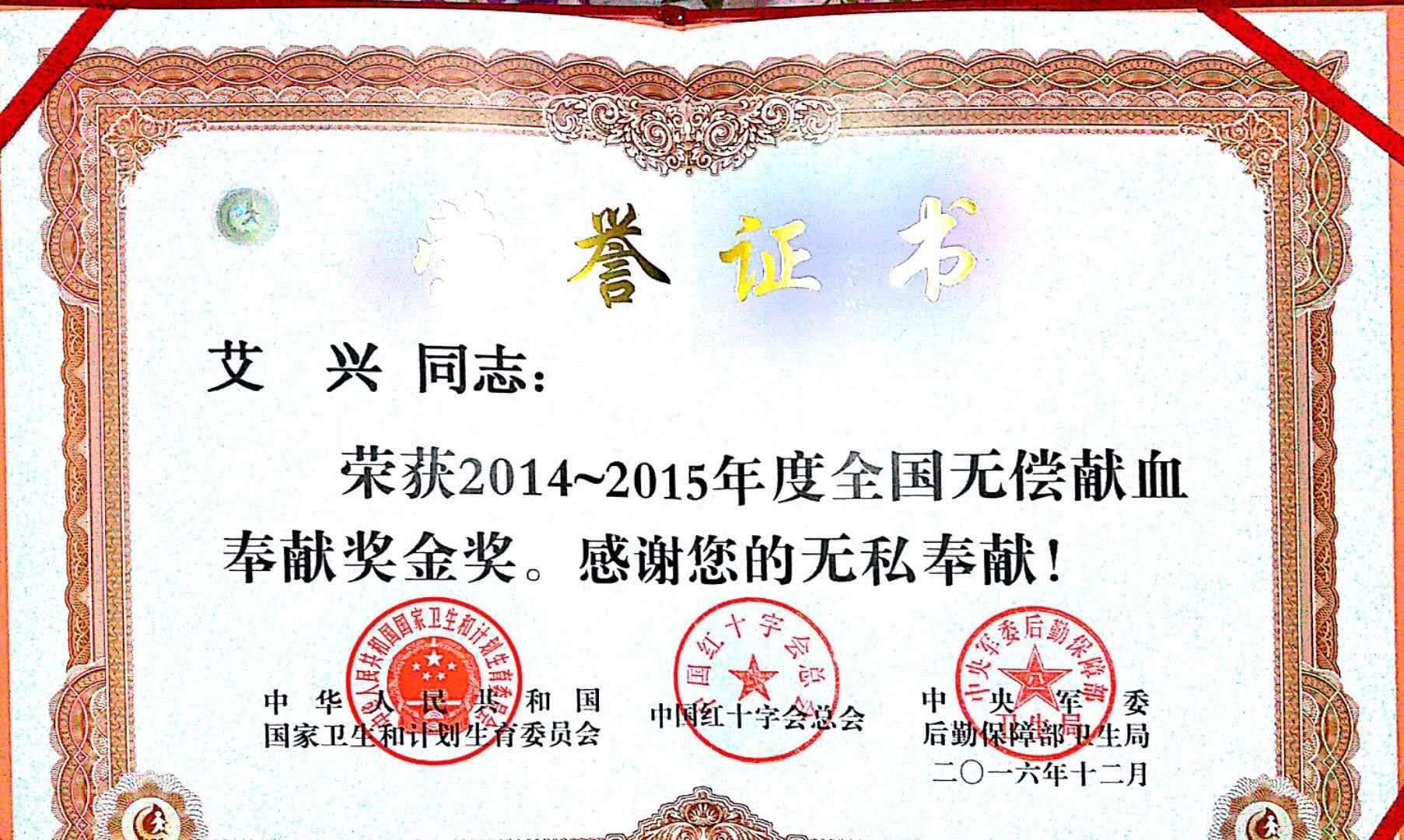 “2008年~2009年度全国无偿献血奉献奖铜奖、2009年~2010年度全省无偿献血奉献奖金奖、2019年度全市无偿成分献血奉献奖、获国家卫计委、中国红十字会总会颁发奖状。”艾兴在献血这条路上拿下的荣誉满满,他坚持献血17年,累计献血17800毫升,积攒下来的献血证已塞满了家中整整一个抽屉。