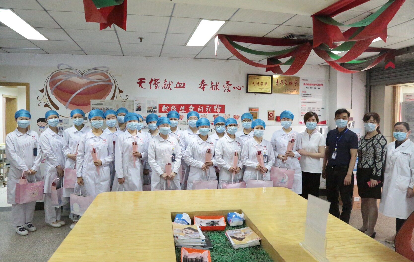 “你们守护我们健康,我们祝福最美的你!”5月12日,武汉血液中心开展纪念第109个国际护士节慰问活动。武汉血液中心领导兵分四路,为武汉三镇18个街头献血点,以及无偿献血一线各个岗位工作的护士们,送去了玫瑰和满满的节日祝福。