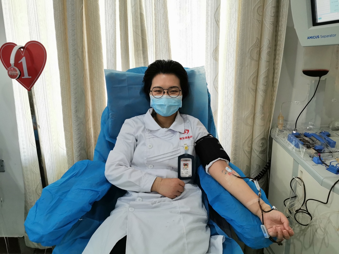 武汉血液中心护士雷旭雯在“护士节”献血(段琼拍摄)