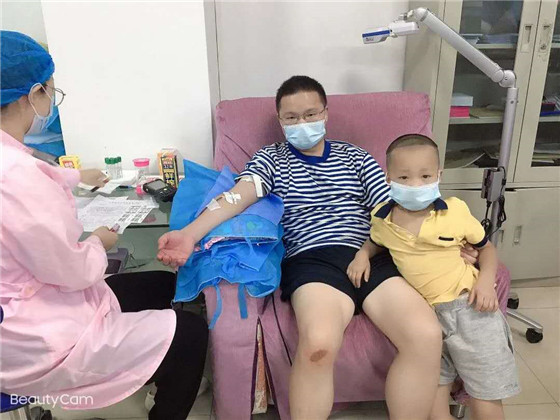 孩子:爸爸献血超勇敢的,我妈妈也献血,妈妈今天还给爸爸采血,我长大了也像他们一样献血救人!