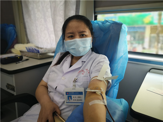 (市第四人民医院中医科副主任医师何艳兰正在献血)