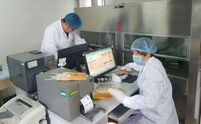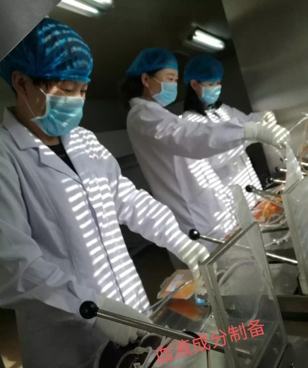 早上8:30,成分科工作人员着装整齐。迅速开始血液的制备:滤白,热合,装杯,离心,上机分离,打签,包装、核对、入库。每一步骤均严格按照sop操作,在规定时间内完成血液产品的制备,保证血液制品的质量,让临床可以用上一份放心的血液制品。