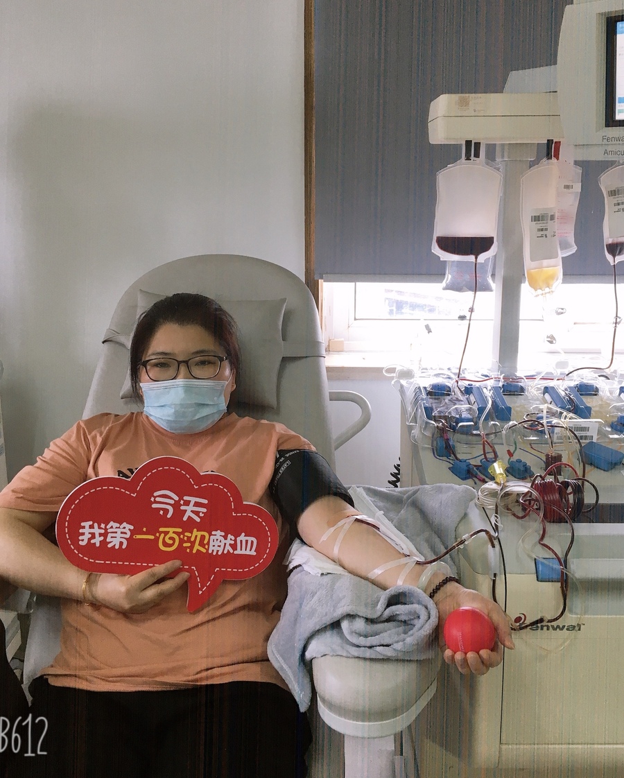 5月17日,在温州市中心血站新城院区,献血者金丽琼献出了对于她而言意义非凡的第100袋血液,荣登献血百次榜。从2001年第一次献血至今,每一袋血液都承载着金丽琼对受血者的祝福,每一份爱心都体现着她多行善举不拘大小,守护生命的初心。