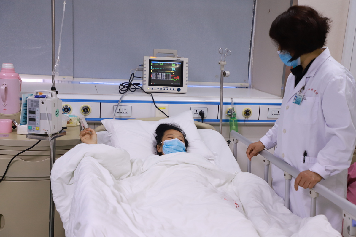 ▲福州市第一医院产科齐碧如主任查看袁女士术后情况