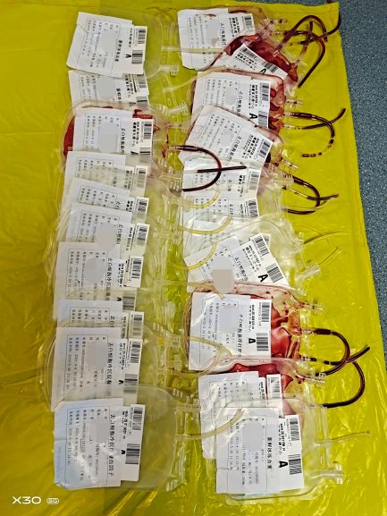 据统计,此次袁女士术前、术中、术后一共输血5000毫升,自体回收1400毫升,用完的血袋铺满了桌面,相当于把全身血液重新更换了一遍。