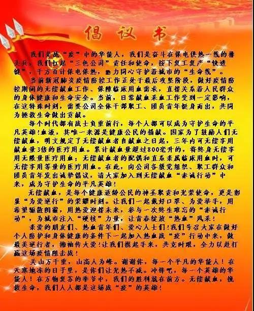自新冠肺炎疫情发生以来,在得知阜康市医院血液供应量不足的情况后,华能新疆阜康热电有限责任公司团委立即向全体青年员工发出无偿献血助力战“疫”的倡议书,在公司各部门中掀起了一场无偿献血的爱心热潮。