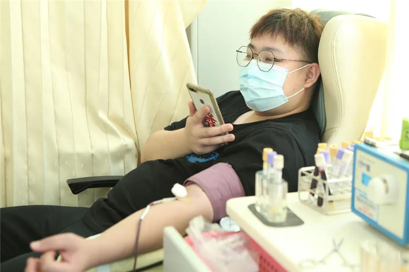 陈志峰、陈明献血时还不忘自拍,说是要留下爱的回忆。孟春霞边献血边说:“前两次都是献200ml,觉得很轻松,这次开始选择捐献400ml,希望挽救更多生命。”