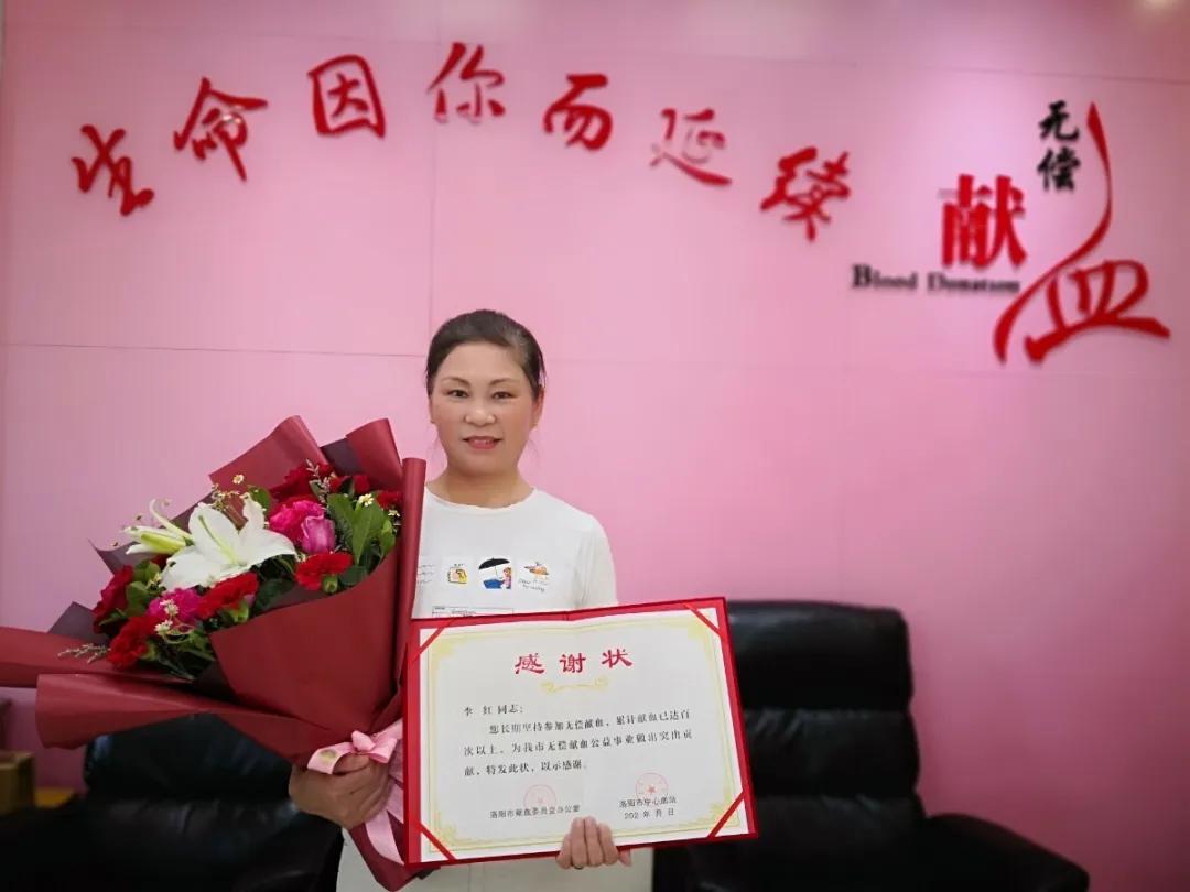 洛阳市第123位百次无偿献血者李红:第1次献血时间2003年12月16日,第100次献血时间2020年5月21日,期间共捐献全血13次5200毫升,机采成分血87次87治疗量,荣获全国无偿献血奉献奖金奖(2016年)。