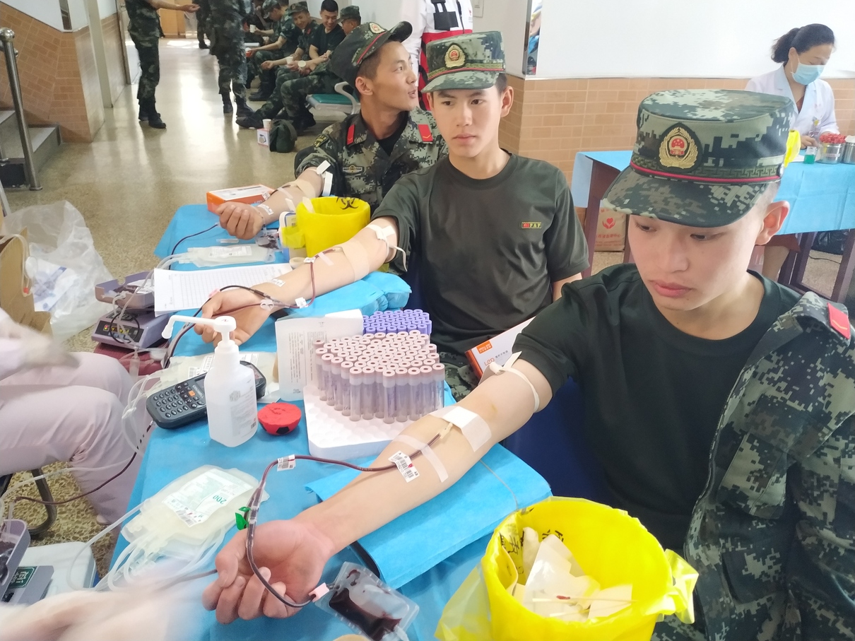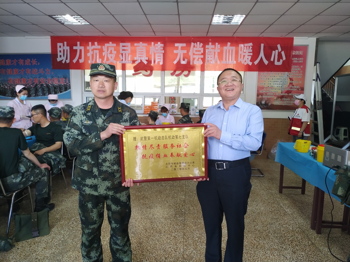 5月29日上午,太原市红十字血液中心的无偿献血车驶进了武警第一机动总队机动第七支队的大院,400余名武警官兵列队整齐,在部队军官的指挥下,有序开展“助力抗疫显真情 无偿献血暖人心”无偿献血活动。通过血液中心工作人员的宣传,当部队领导得知血液库存不足的时候,当即表示,“军民本是一家,我们支持地方工作”,积极组织动员部队官兵们参加献血活动,为无偿献血贡献一份力量。活动过程中,献血的官兵们也表示,“虽然没能到抗疫一线,但在后方能尽最大努力为防控疫情助力,保障人民生命安全的健康,我们感到很开心。”中心主任白林赠予武警第一机动总队机动第七支队“热情尽责服务社会,抗疫捐血奉献爱心”牌匾,感谢他们在在阻击疫情这场没有硝烟的战争中,所做出的贡献,致敬!最可爱的人!