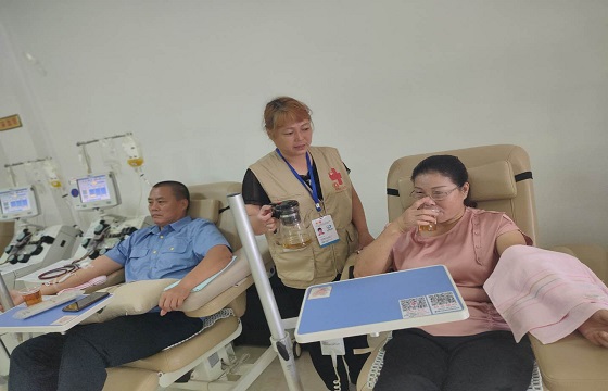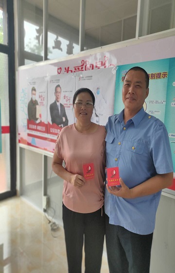 在献血等侯间隙,谢金华的嫂嫂周美兰说:“我和我丈夫经常来献血,但极少碰到金华,今天能碰到一起真的难得哈!”问起献血经历,周美兰回忆道:“第一次献血是在2004年,受丈夫的影响,也开始献血了。我丈夫献血更早,他是1999年就参与无偿献血了。”自那以后,他们夫妻俩就一直坚持定期献血。如今,周美兰夫妇已献血共120次,其中周美兰献血43次(全血2次,机采血小板41次)她丈夫谢建福献血77次(全血12次,机采血小板65次)。