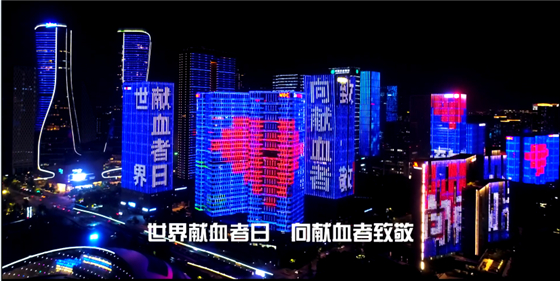为表达对无偿献血者的敬意,杭州市卫生健康委员会、杭州市城市管理局、杭州市钱江新城建设管理委员会、上城区政府、滨江区政府联合杭州无线数字电视股份有限公司和浙江华数广电网络股份有限公司自6月12日起连续五天在钱江新城、钱塘江两岸举行“世界献血者日”主题灯光秀。全市120块户外电子显示屏、13000余台公交移动电视以及8400余块地铁电子屏联网同步播放致敬无偿献血者的宣传片,为广大无偿献血者“点亮杭城”。