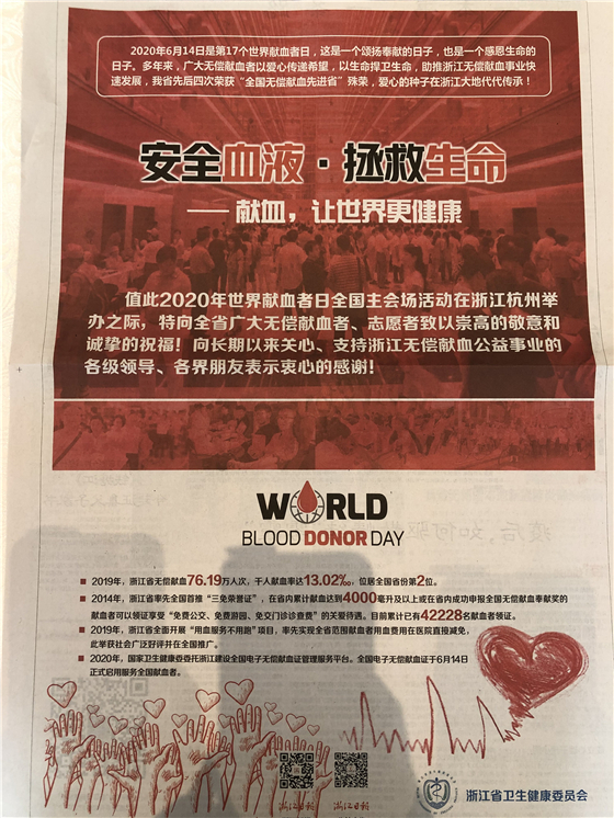 2020年6月14日上午9时,2020年“世界献血者日”主题宣传全国主会场活动在浙江杭州隆重举行。