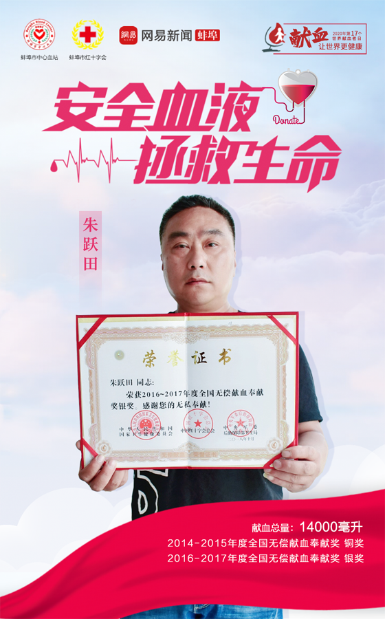 掬水月在手,弄花香满衣。截至目前,朱跃田无偿献血总量已达14000毫升,先后荣获2014-2015年度全国无偿献血奉献奖铜奖、2016-2017年度全国无偿献血奉献奖银奖。朱跃田用一次次的挽袖献血,延续了众多患者的生命,用二十年来的身体力行告诉我们,生命不息,公益不止!