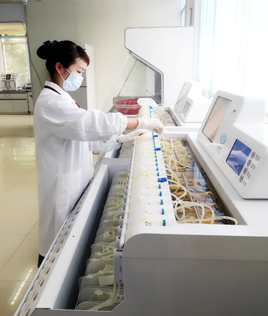 高速离心、分离制备、速冻……,不同的环节,标准的流程,在各种血液精密仪器设备的规范运行下,在科室工作人员的熟练操作下,一袋袋血液的制备“旅程”正在有序进行着。