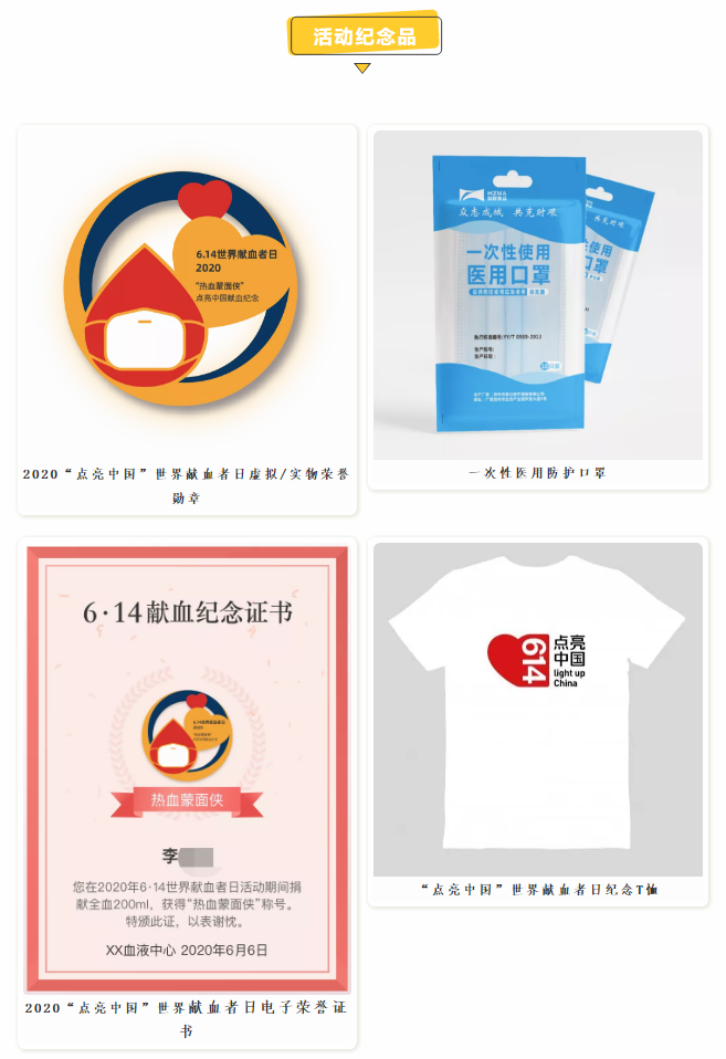 为积极营造浓厚的节日氛围,中心对在活动当天参加无偿献血活动的献血者提供了专属礼物,赠送精美节日纪念品一份,品种包括614纪念T恤衫、614荣誉勋章、一次性医用防护口罩包等。