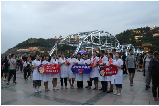 当晚,在兰州市中山桥南侧广场上,挥舞的小红旗,热烈的阵阵喝彩声,还有一句句映照在河面的感谢语……甘肃首届“点亮”世界献血者日主题活动在母亲河畔拉开了序幕。这里成了一片欢乐的海洋,数百余人欢聚在此,通过歌唱祖国,合影留念等方式共同庆祝这神圣而庄严的时刻。