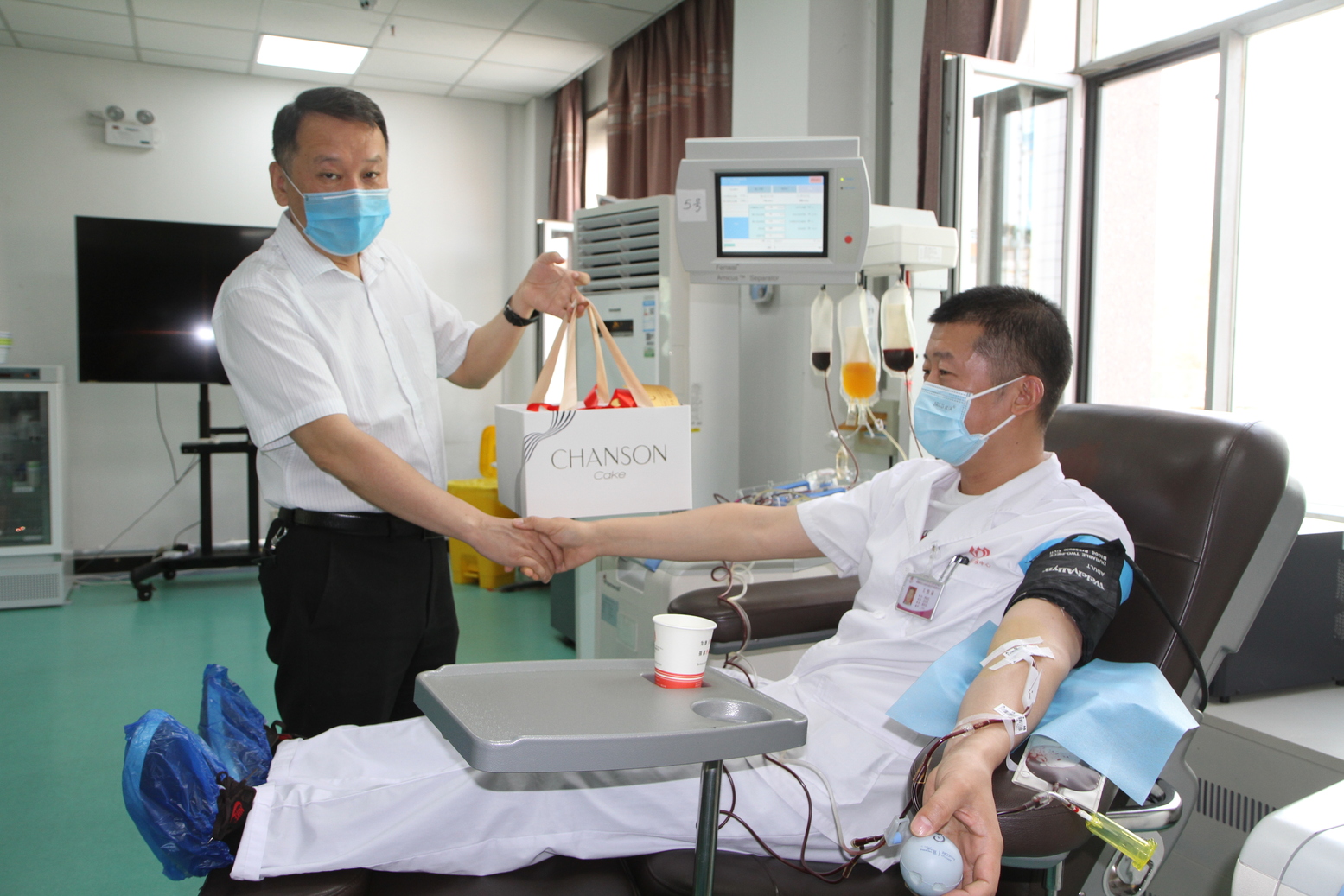 图为乌鲁木齐市卫生健康委张卫主任给市血液中心献血者成分制备科副科长顾晓东送蛋糕