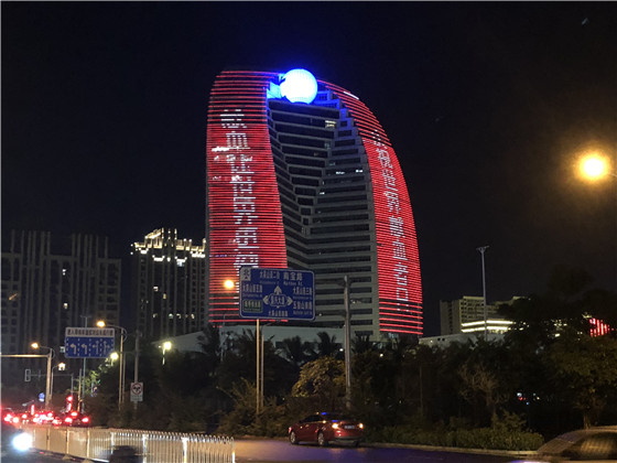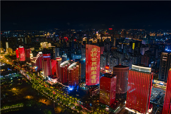 当晚,海口和三亚地标性建筑同时为无偿献血者而亮,以“献血,让世界更健康”、“庆祝世界无偿献血者日”为主题的灯光秀同步滚动播出,由南至北交相辉映,用属于献血者的色彩,点亮了琼岛的夜空。