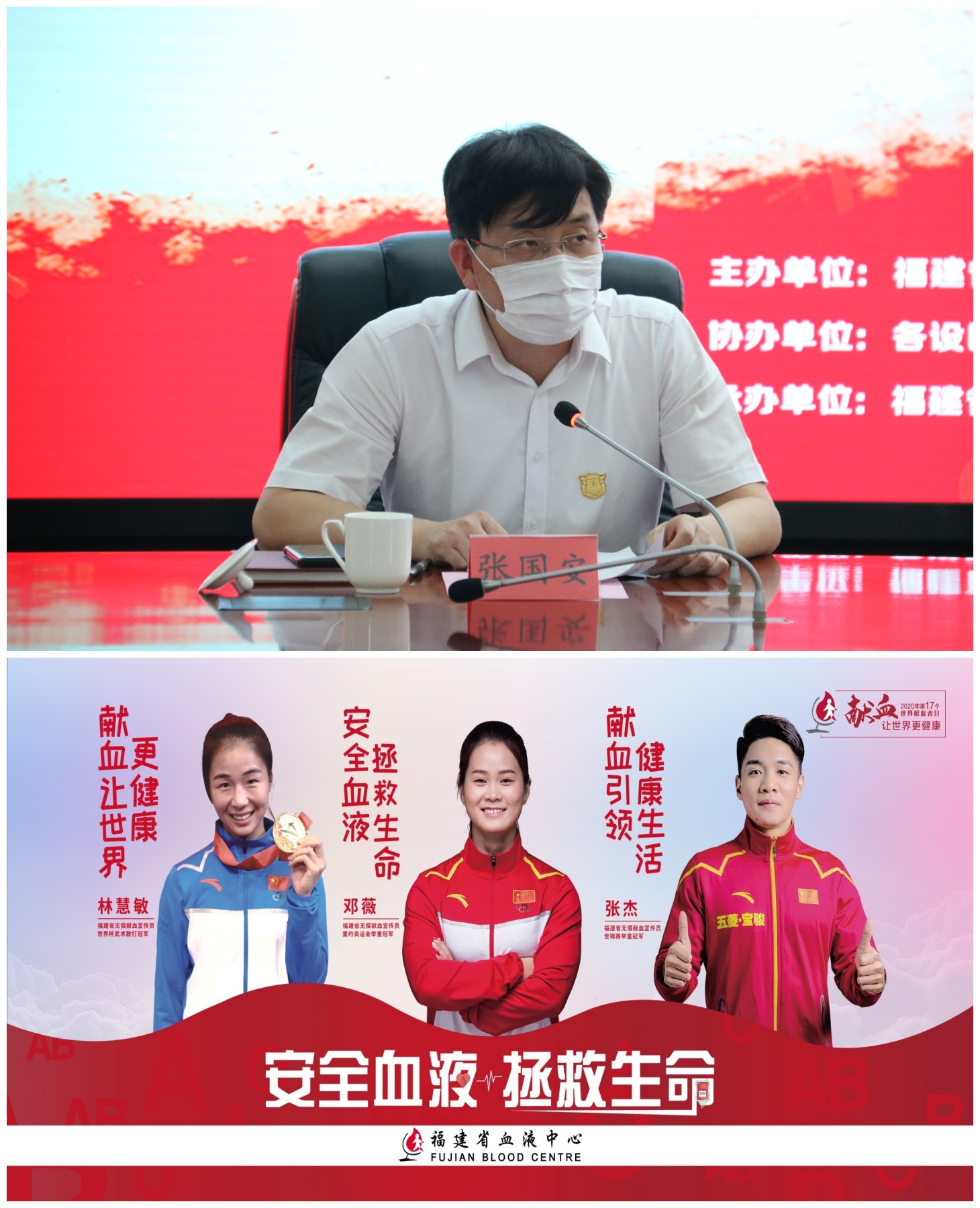 会议中,福建省献血工作办公室负责人、福建省卫健委医政处处长张国安介绍了3位福建省无偿献血宣传员,他们是举重奥运冠军邓薇、散打世界冠军林慧敏、举重世界冠军张杰。