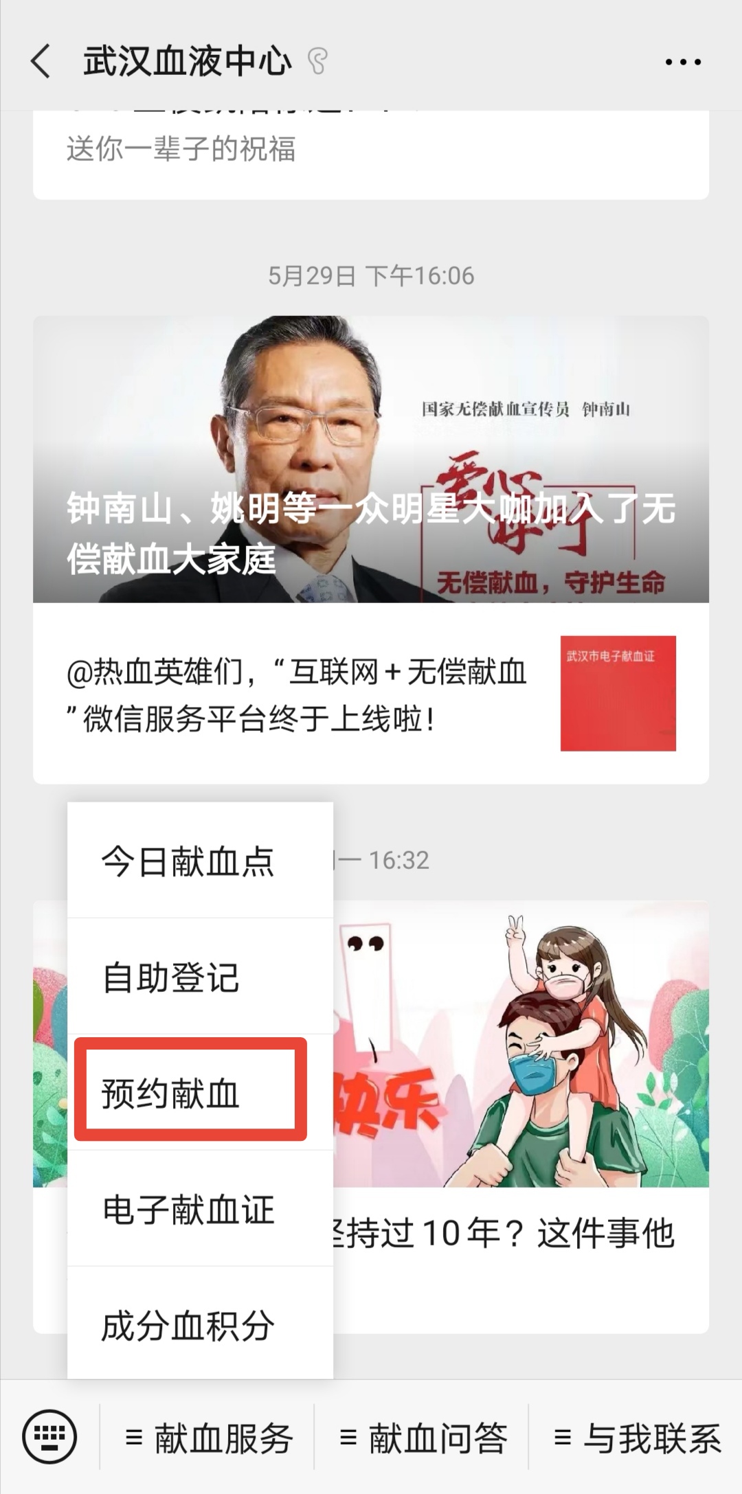 “武汉血液中心”微信公众号中可以进行“预约献血”服务