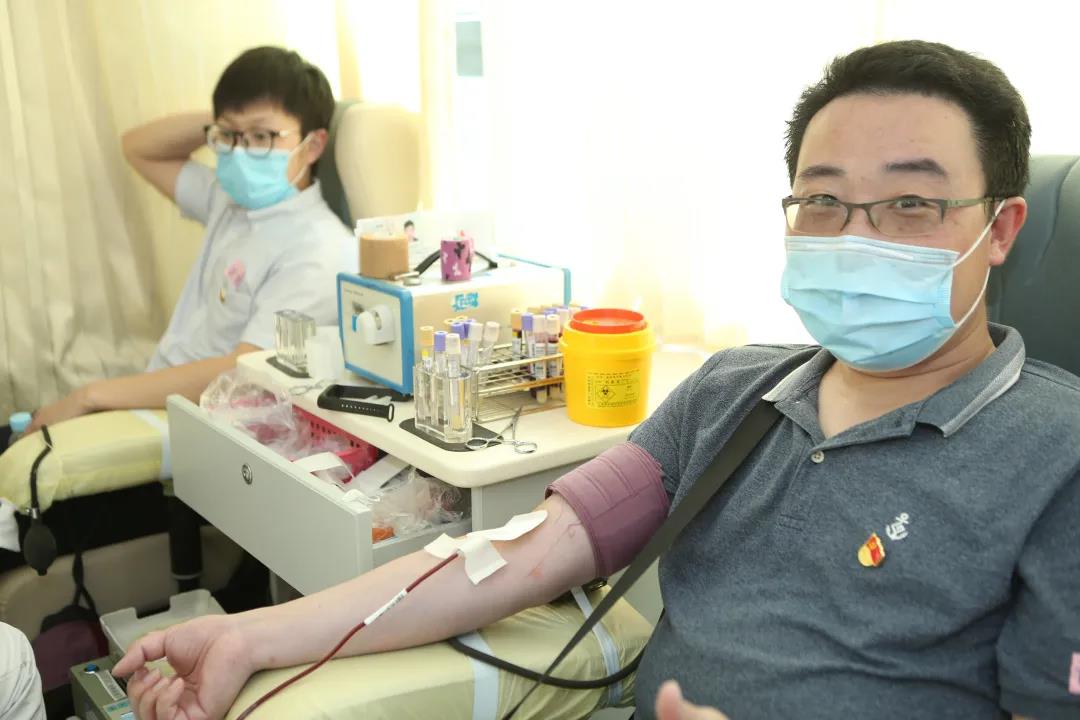 上海日之升新技术发展有限公司党支部副书记许群和党员钱秀军、辛雯婷、王尹杰等赶来分别献出热血,许书记边献血边说:“时下,正在开展‘四史’学习教育活动,我们要把学习体会转化到实际行动中来,希望以献血救人的方式践行党员的初心使命和责任担当。”