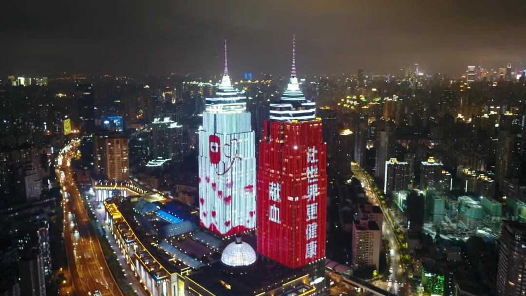 为表达对无偿献血者的敬意,普陀区商业地标建筑环球港也在6月14日当晚同本市地标性建筑东方明珠广播电视塔、美罗城、中华艺术宫、震旦国际大楼等,同时亮起“生命红”,致敬无偿献血者。