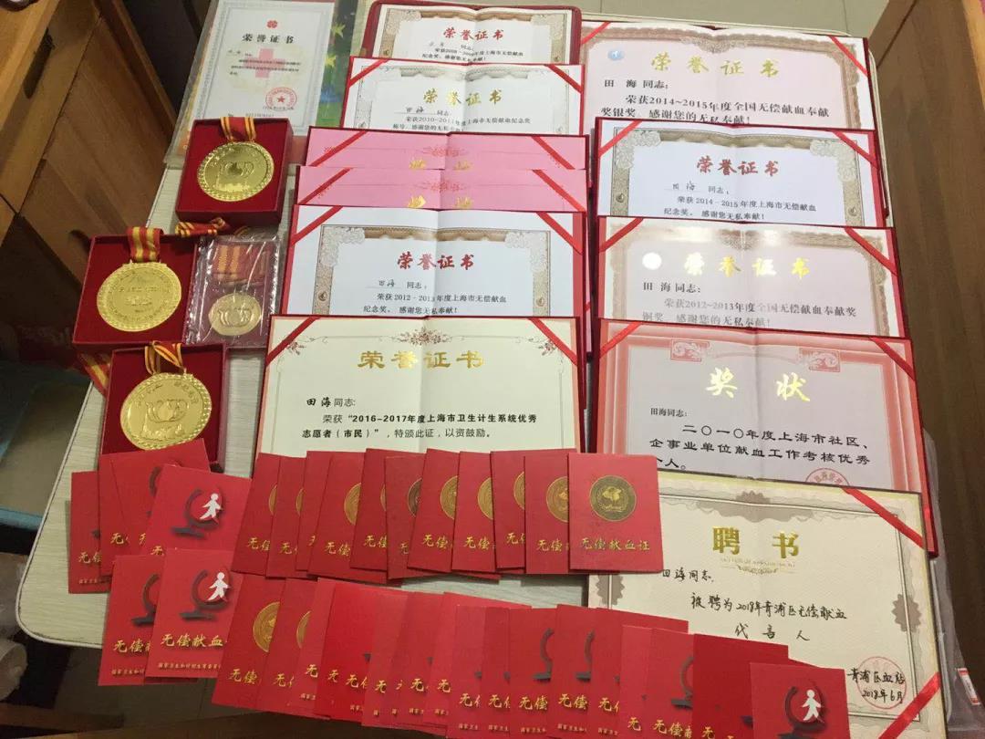 对于献血,起初家人都不赞成,全部都是反对意见,尤其是八十年代时的卖血事件,家人都认为献血对身体不好。通过田海的多次解释与沟通,家人也慢慢转为理解与支持。从此后每年都在坚持献血,从2006年至今他的献血总量已经达到8600ml,先后获得上海市无偿献血纪念奖,全国无偿献血奉献奖铜奖、银奖。