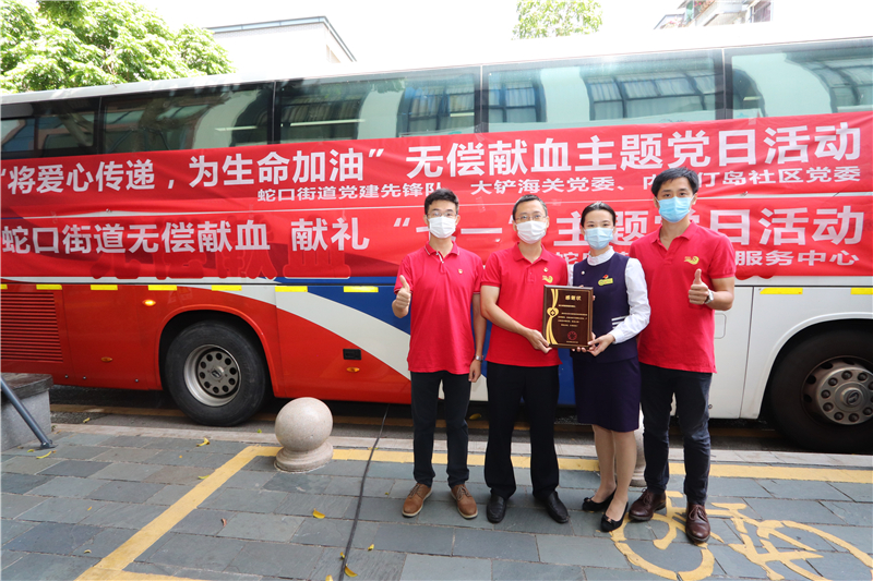 6月29日上午,在蛇口街道党群服务中心门口,蛇口街道党建先锋队联合内伶仃岛社区党委和大铲海关党委,共同开展了一次“将爱心传递,为生命加油”的公益献血党日活动,为即将到来的"七一"献礼。