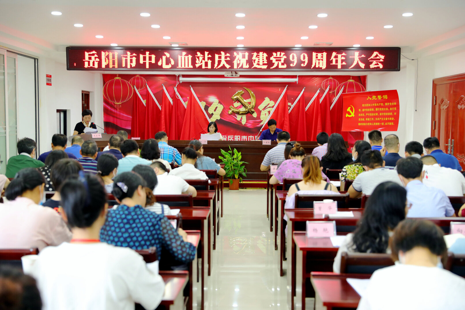 6月30日,市中心血站全体党员集中开展庆祝建党99周年暨优秀共产党员表彰大会,市卫健委党组成员、副主任孙奕同志及全站党员干部职工120余人参加会议。通过重温入党誓词、表彰先进、上专题党课等活动,激励基层党组织和广大党员充分发挥战斗堡垒和先锋模范作用,为加快推进健康岳阳建设作出更大贡献。会议由血站党委书记、站长方奎明同志主持。