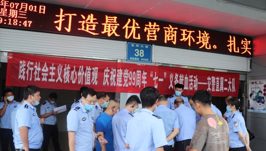 为庆祝中国共产党成立99周年,进一步弘扬无偿献血、无私奉献、乐于助人的传统美德,宜春市公安局交警支队直属二大队用无偿献血的实际行动向党的生日献礼。