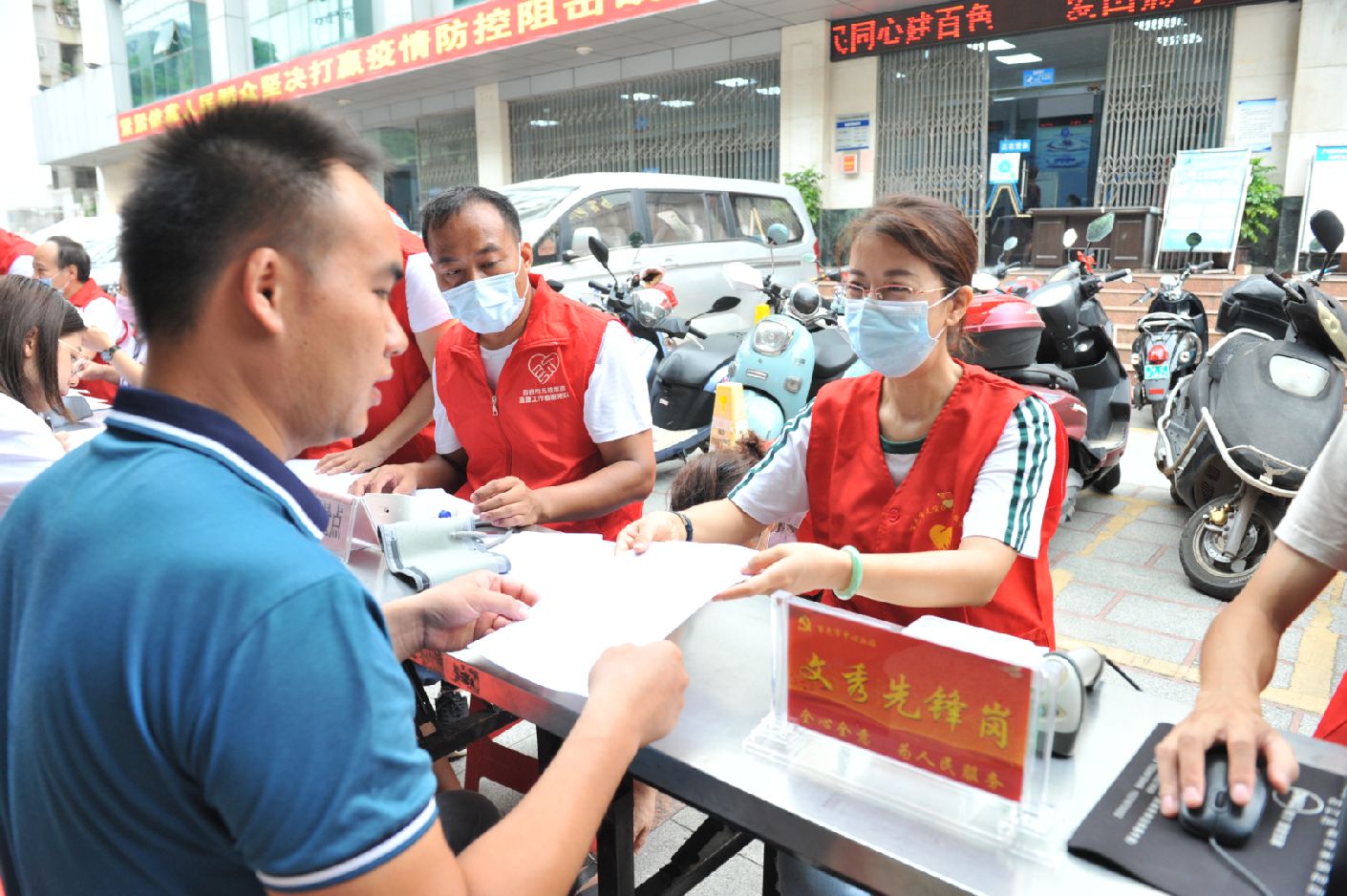 活动现场,在两个支部书记梁朦尹、马桂荣的带领下,身着红马夹的志愿者穿梭于活动现场,为前来献血的干部职工征询、指导填表、测体温、量血压,为过往群众宣传发放无偿献血和捐血造血干细胞相关知识资料,据不完全统计,他们不仅为前来参加献血的124名献血者提供贴心、周到的服务,同时为过往群众发放无偿献血相关资料500余份,志愿者忙碌的身影俨然现场一道靓丽的风景,为特殊防控时期保证临床医疗用血助力。