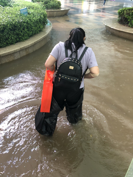 按压好针眼后,正准备离开,由于万达广场献血点处于低水位,不到二十分钟积水已经可以没过小腿了,下车一定会让鞋子浸透的,我们只有临时让谭根文套住两个大袋子以免湿了鞋。好在雨小了些,不然伞也没法撑。