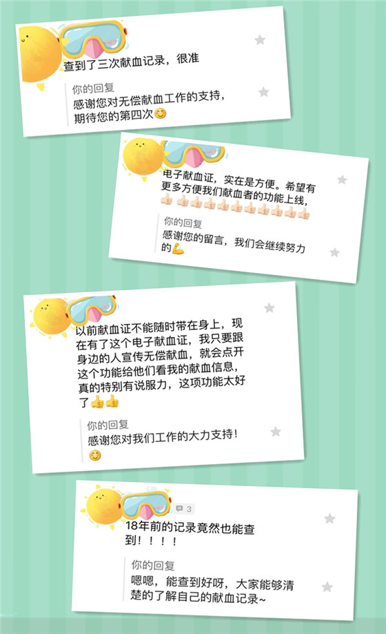 随着全国电子《无偿献血证》的广泛使用,无偿献血从“纸质时代”进入“电子化时代”,通过多渠道、多功能、全方位的献血关爱,让献血者能够体验更多的“数字化”优质献血服务,方便、新颖的使用体验也有力推动了无偿献血宣传工作。安康市中心血站将进一步收集献血者的意见和建议,积极推动血站信息化、智慧化建设。希望广大献血者能继续关注无偿献血工作动态,一如既往的支持无偿献血公益事业!