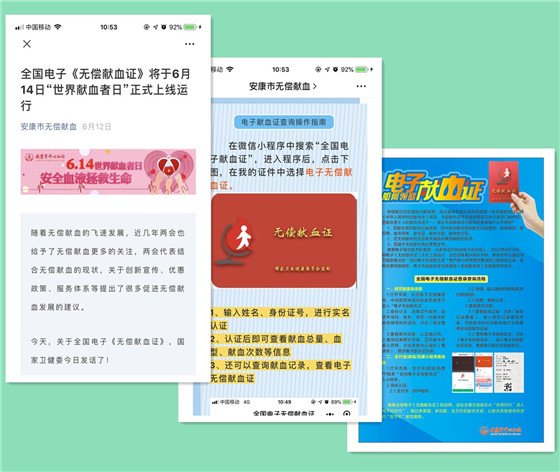 安康市中心血站为保证广大献血者方便快捷的使用此功能,通过微信公众号、宣传海报等方式开展了一系列图文并茂的宣传,详细介绍了如何通过微信、支付宝等手机APP程序快速查询献血者本人的献血信息,并对献血者发来的相关咨询也做出了详细的解答。电子献血证上线以来,我市广大献血者对电子献血证的使用表示非常满意,尤其通过手机便能随时随地查询到自己详细的献血过往信息,更大大提升了无偿献血带来的荣誉感。许多献血者发来留言表示:“以前献血证不能随时带在身上,现在有了这个电子献血证,我只要跟身边的人宣传无偿献血,就会点开这个功能给他们看我的献血信息,真的特别有说服力,这项功能太好了!”