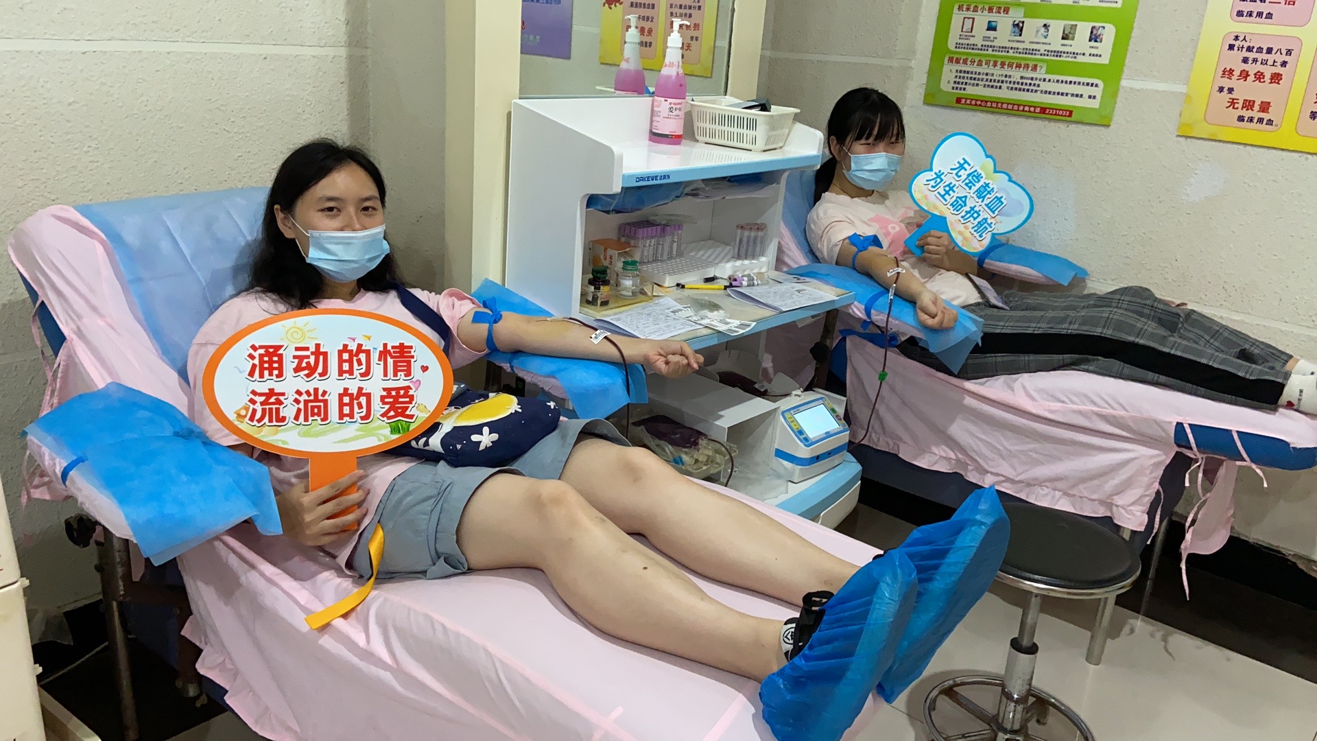 现年23岁的罗先丽(图左)和现年19岁的瞿瞿(图右)一同在爱心献血屋参加献血的场景