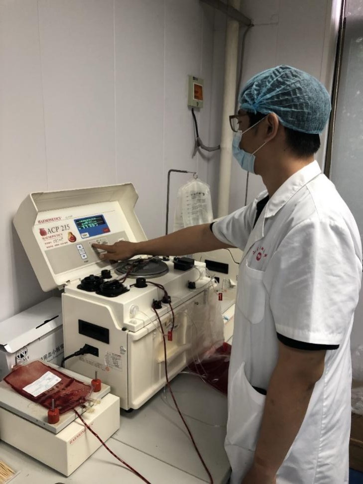 成分科工作人员进行冰冻红细胞的解冻