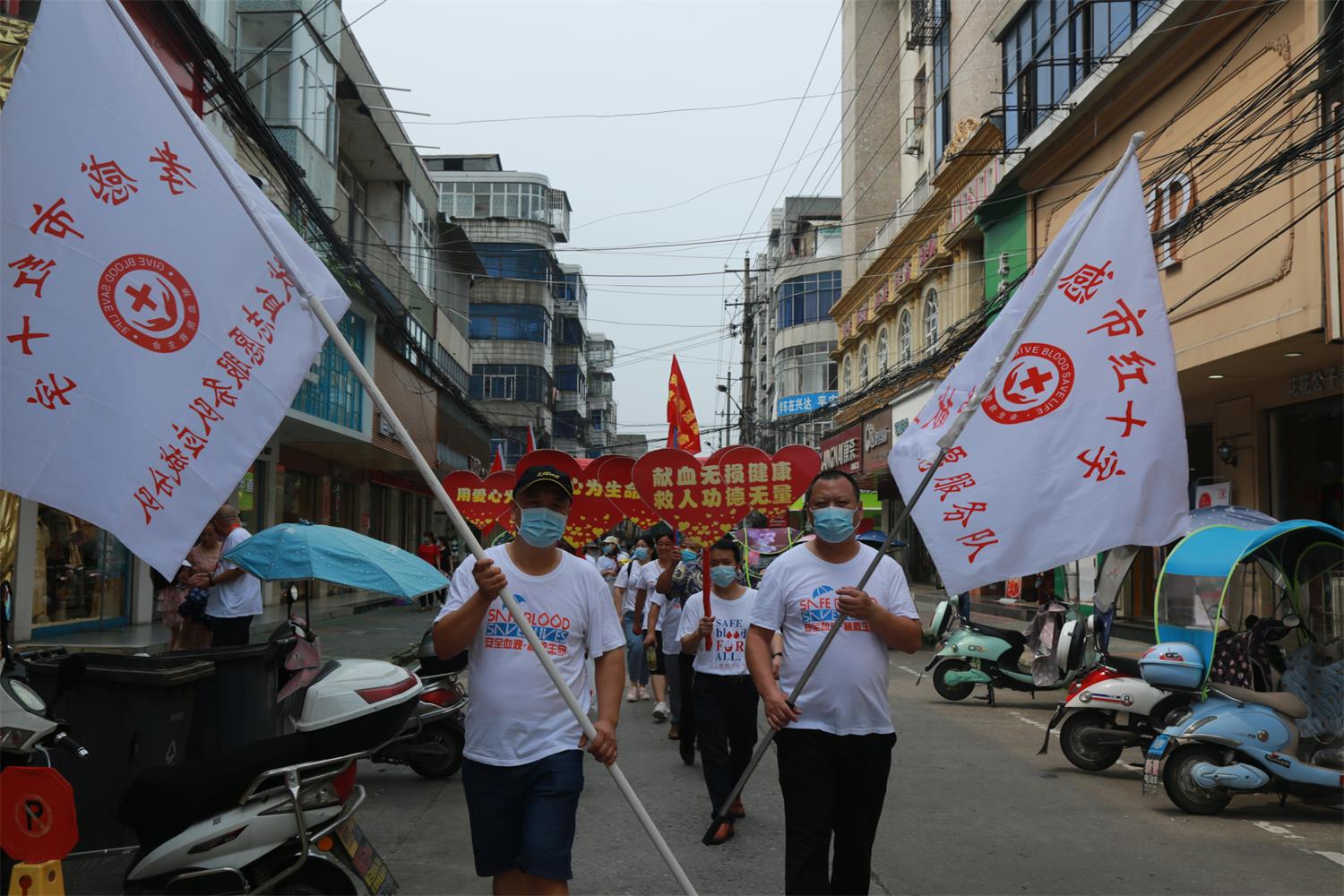 当天,志愿者举着队旗、宣传牌在应城街头宣传无偿献血