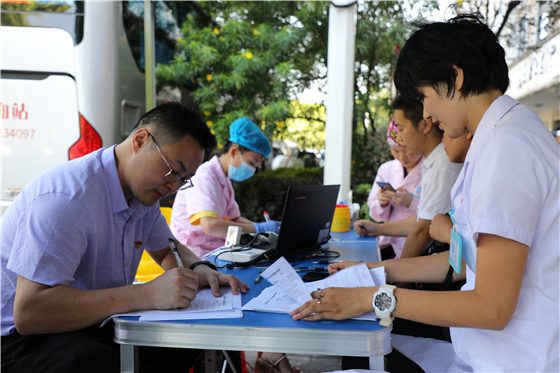 在活动现场,院第二党支部书记唐文涛、第三党支部书记曹俊率先垂范,早早地就填写好了献血征询表,等待体检初筛。