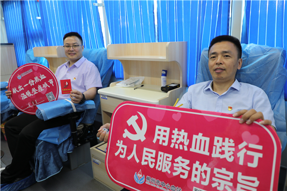 院第二党支部书记唐文涛(右一)、第三党支部书记曹俊(左一)带头献血