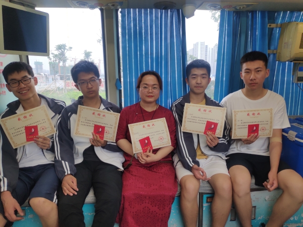 7月10下午6时许左右,高考刚结束,潍坊一中高三1部6班的班主任侯晓彬带着4名刚高考完的学生王子硕、付澎坤、庞子竣、王松海,来到永春路与梨园街交叉路口附近的一辆采血车上,共同展臂献血,做了高考完第一件有意义的事情。