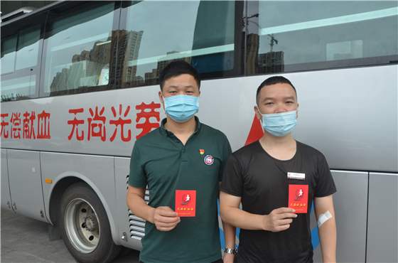 陈浩明(左一)与入党积极分子刘骅轩(右一)参加献血