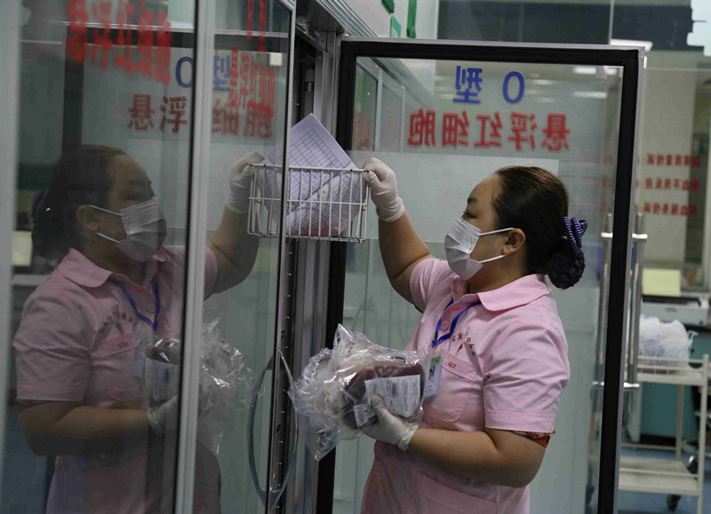 今年6月2日,随着冰冻红细胞制备技术的重新启动,周磊又一次来到血站位于小碑巷的爱心献血屋献血。值得一提的是:周磊前两次在宜宾参加献血,都是在患者急需时才去献血的,而第三次献血则是未雨绸缪,将自己的爱心奉献在了患者需要之前,这样就为救治垂危的生命赢得了更加宝贵的时间。针对冰冻红细胞的制备工作流程,血站业务科科长卿小玲介绍说:“该技术是将红细胞转移至容量适当的、适宜于冰冻保存的转移袋内,在无菌条件下缓慢滴加40%的复方甘油溶液至红细胞袋内,使其充分混匀。然后在-65℃以下储存,自采血之日起可保存10年。”血站供血科科长马丽表示:“自血站开展冰冻红细胞制备技术以来,每种血型的RH阴性稀有血液库存都在1000毫升以上。今年以来,血站已先后为全市各用血机构提供经检测合格的稀有血型血液19300毫升,在确保全市稀有血型患者医疗急救用血安全的同时,还先后向其他兄弟血站提供宝贵的“熊猫”血液4400毫升。”