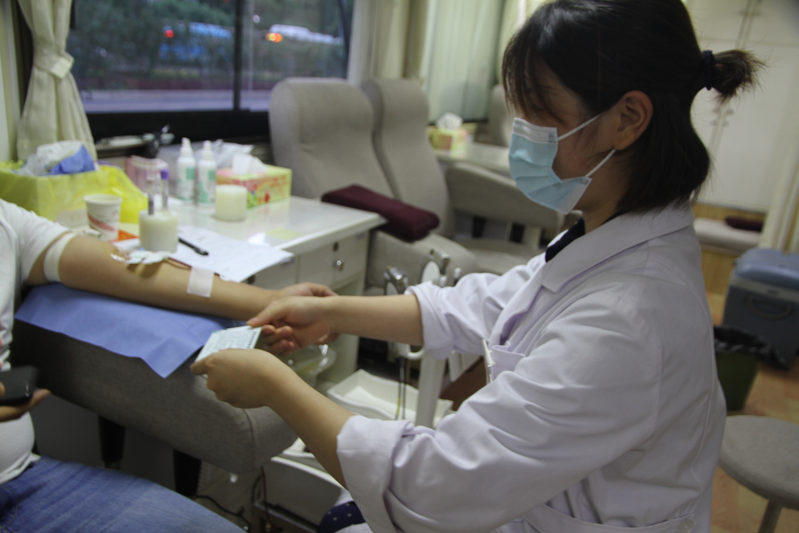 在经过了一天高温炙烤的万达广场献血点,献血车上的医护人员放弃了与家人共享天伦之乐的时光,依然坚守岗位。龚敏是万达秋水广场献血点的一名医护人员,目前她在此献血点工作己经有一年了,她笑起来眼睛弯弯,献血者们都夸这个护士采血技术好,服务棒,疫情期间血站很多医护人员都通过献血来支援抗疫,龚敏就是其中一员,她说:“用自己的行为示范献血者,宣传献血才更有说服力,对我自己来说,其实无所谓上白班还是晚班,哪个时间段献血的人数更多,我就更愿意上哪个班。”