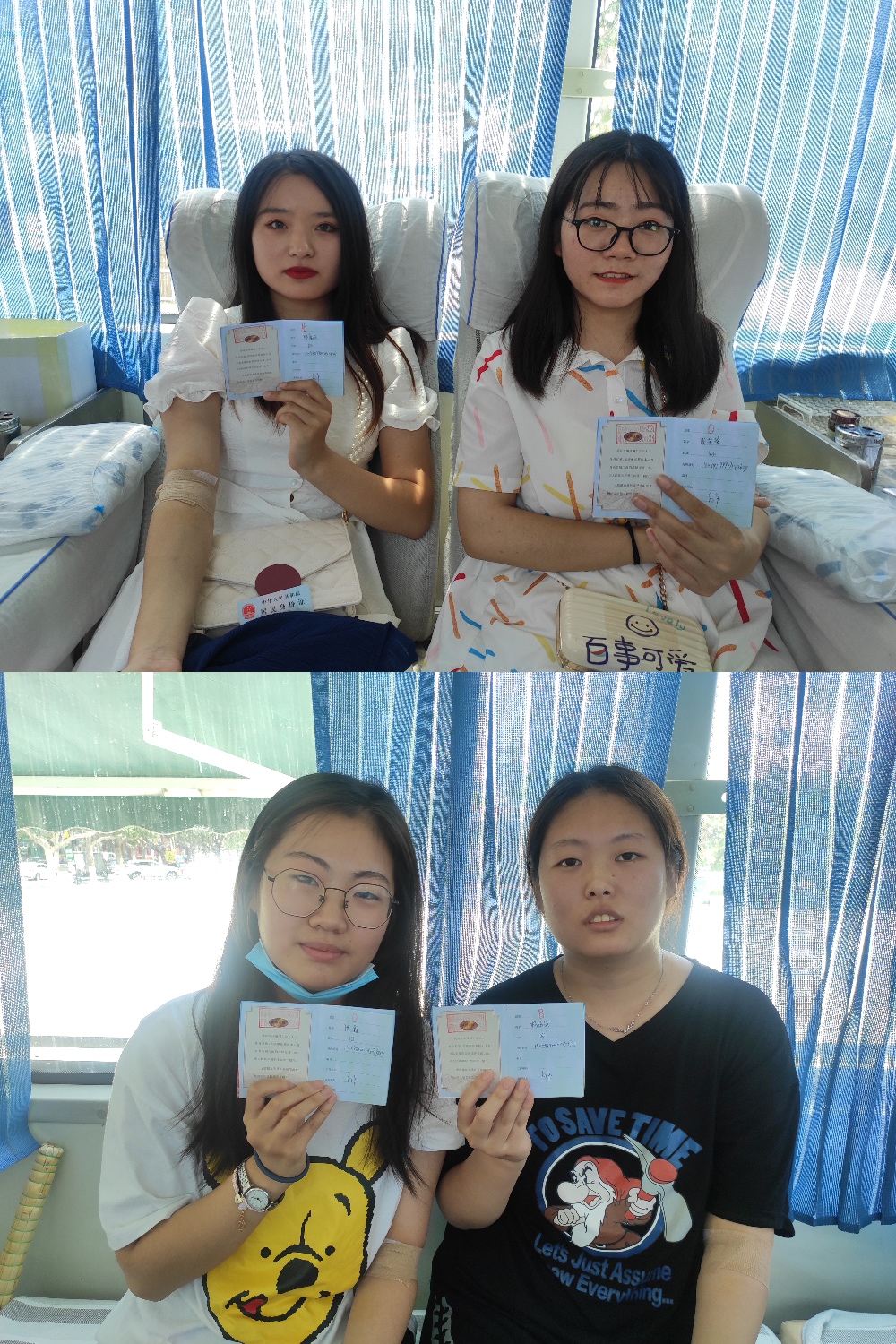张鑫说,平时学习很忙,也很少上街,从身边人得知最近天气炎热,献血的人不是很多,我们正好有时间就来参加无偿献血。再说,献血对自己身体也有益处,是件利人利己的事,作为一个新时代青年,应成为全社会无偿献血的先行者和表率,前几日特地和小姐妹来咨询献血注意事项,做好充足准备,今天如愿以偿成功献血。杨涵斌表示:“我们是年轻的大学生,是社会的未来。我们应该多做一些对社会有意义的事情。学会关爱、学会奉献。无偿献血,我们会一直坚持下去!”一群风趣幽默女大学生们,在有说有笑中成功献血。当天她们累计献血1600毫升。