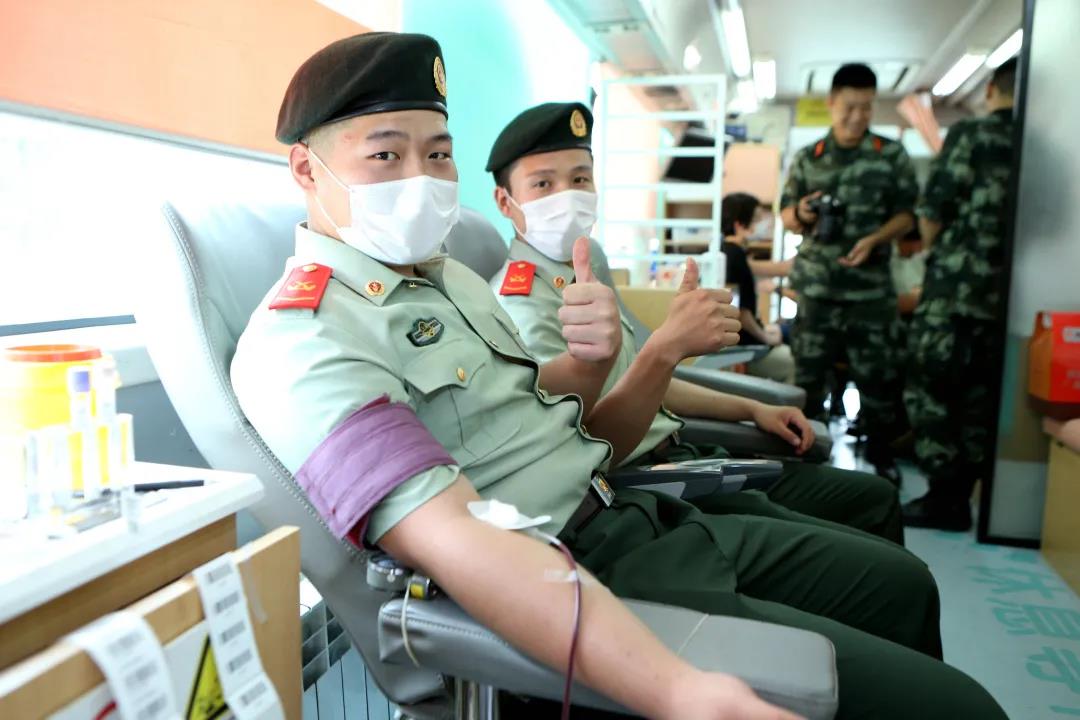 8月11日,武警上海总队执勤三支队的刘健国、赵海涛、林文渊、彭磊等10余名即将脱下军装退伍返乡的武警战士分时分批登上停靠在部队大院的闵行区“小血人”爱心献血车,慷慨地伸出臂膀以捐献热血挽救他人生命的特殊方式告别“第二故乡”。