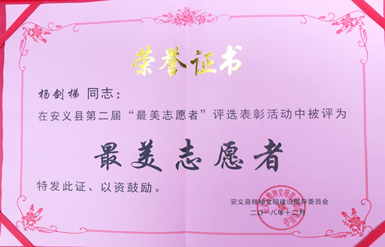 2019年元月11日,安义县召开表彰大会,表彰“最美人物” 、“三风榜样人物”等。省无偿献血志愿者协会省直服务队志愿者杨剑梯获“最美志愿者”荣誉称号。
