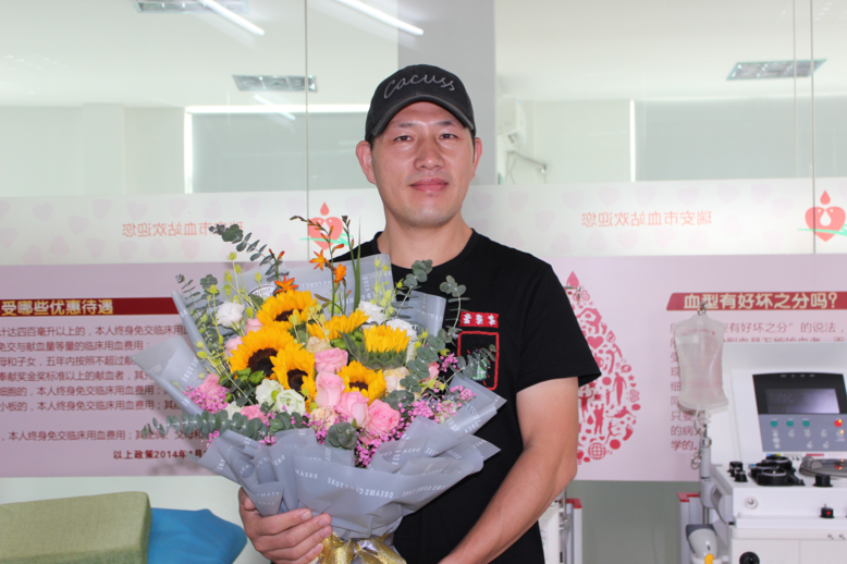 8月11日9时许,无偿献血志愿者蔡云龙再次来到瑞安市血站捐献血小板,此次献血是他在瑞第一百次献血。献血完成后,市血站站长郑昌清为他献上了鲜花,以感谢他的奉献。