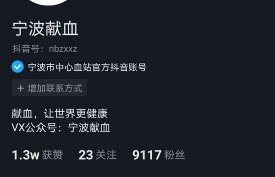 “宁波献血”是宁波市中心血站的官方抖音账号,于2020年5月12日建立,定期发布无偿献血科普视频、献血主题活动等,旨在拓展无偿献血宣传途径,让更多的人关注、支持并参与无偿献血。目前,“宁波献血”官方抖音粉丝数为9117,发布视频26个,曝光量达20余万。