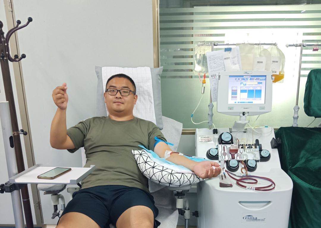 8月3日,张凯团坐在采血椅上,看着血液缓缓的沿着采血管流向采集仪器,分离出淡黄色的血浆和血小板;随后,这些红色血液又输送回身体,此时他脸上洋溢出喜悦的笑容。截止今天张凯团又成功捐献2个治疗单位的血小板,完成了他第25次血小板捐献。