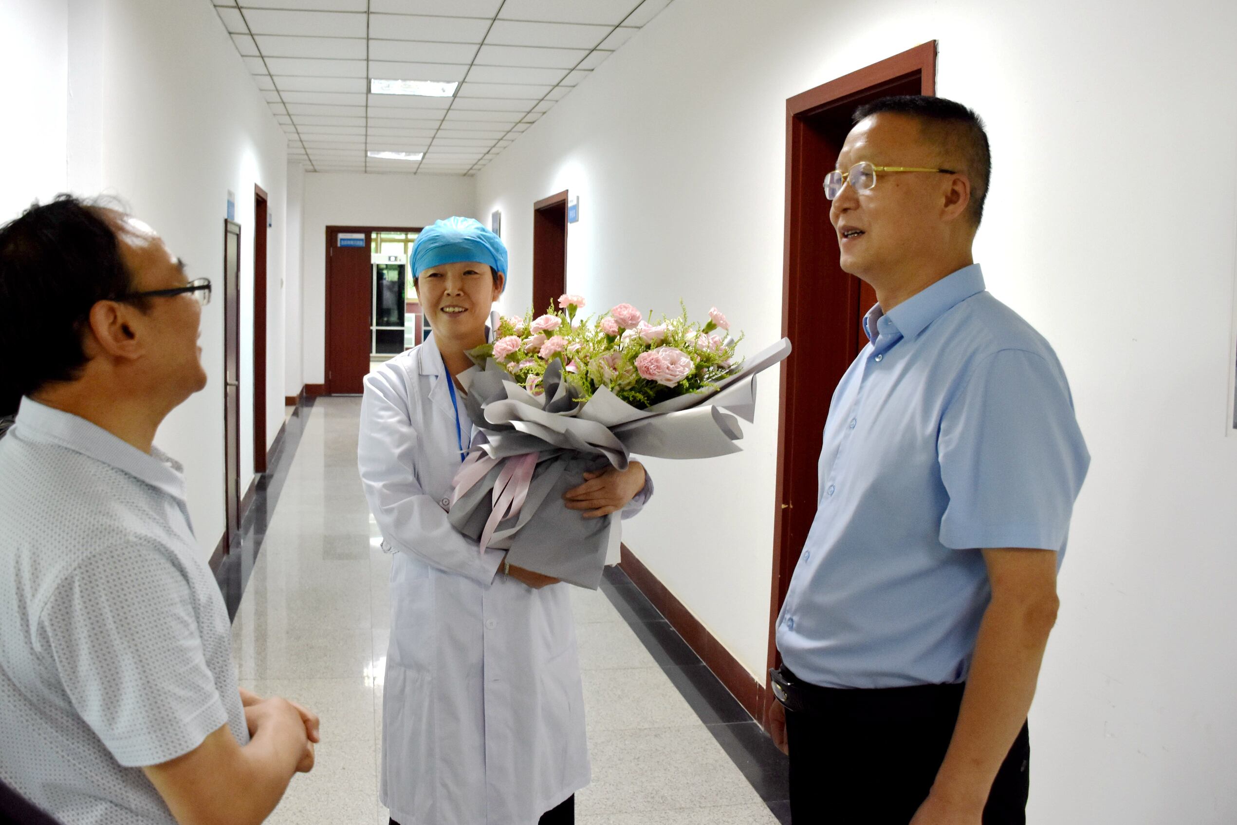 王都让一行首先来到我站成分科,向我站医师代表、成分科主任何宝红送上节日鲜花,表达对一线医务工作者的节日祝福。同时深入体检采血科机采室、供血科及检验科等一线科室,亲切慰问采供血工作人员,对我站在抗击疫情、保障全市血液质量安全方面作出的成绩给予高度肯定。他勉励采供血战线医务工作者爱岗敬业,开拓创新,奋力夺取疫情防控和采供血事业发展双胜利。